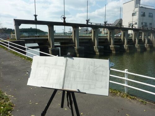 2016年3月 倉敷市玉島に来ました。玉島図書館の西隣には家庭裁判所があり、その横に溜川(ためがわ)が流れています。その溜川にはやっと車が1台通れるぐらいの幅の石橋がかかっていて、それにそって大きな水門があります。玉島にはいくつか大きな水門…